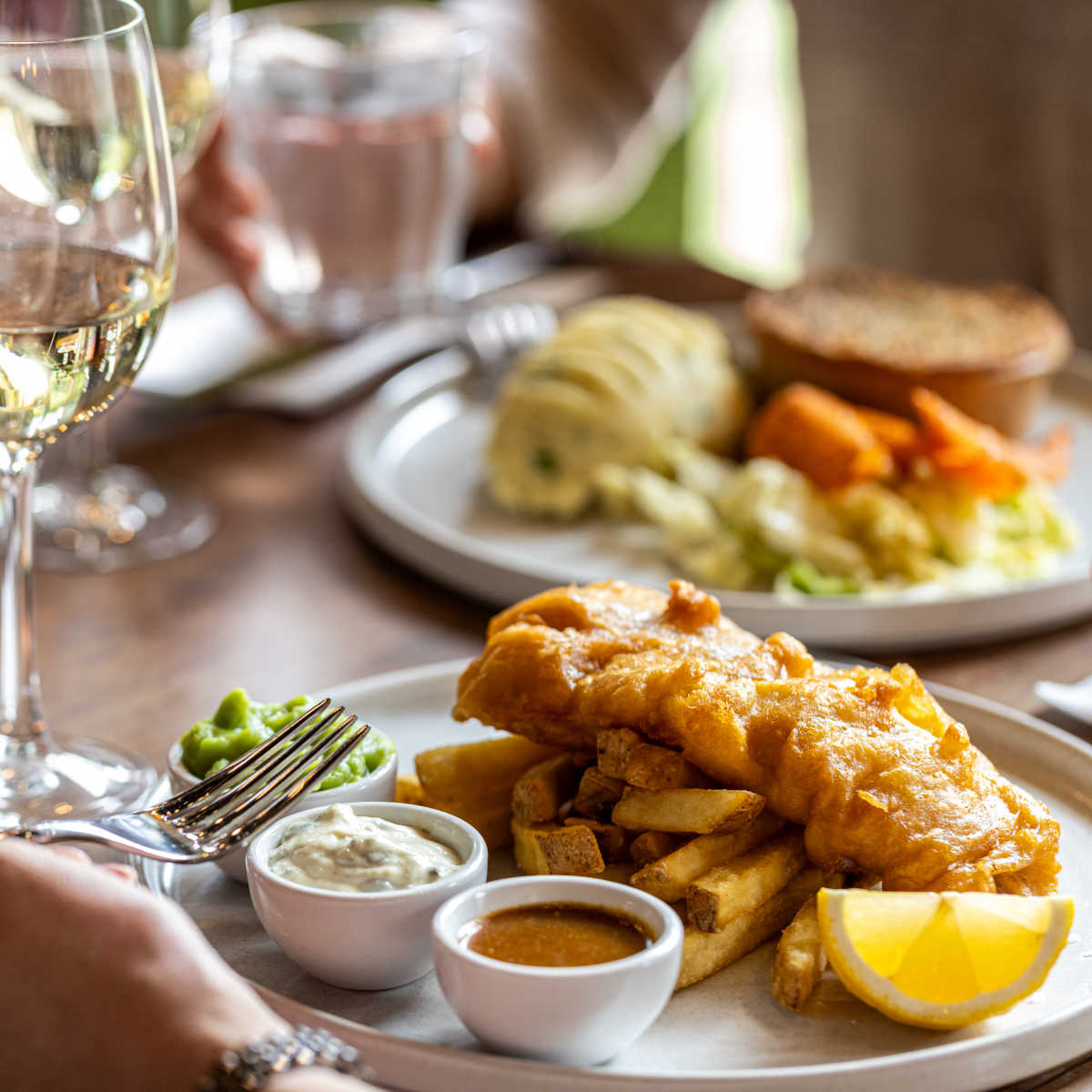 Beer-battered fish and chips, tartare & curry sauce, your choice of garden or mushy peas (†) lunch size | 11.50 1241 kcals